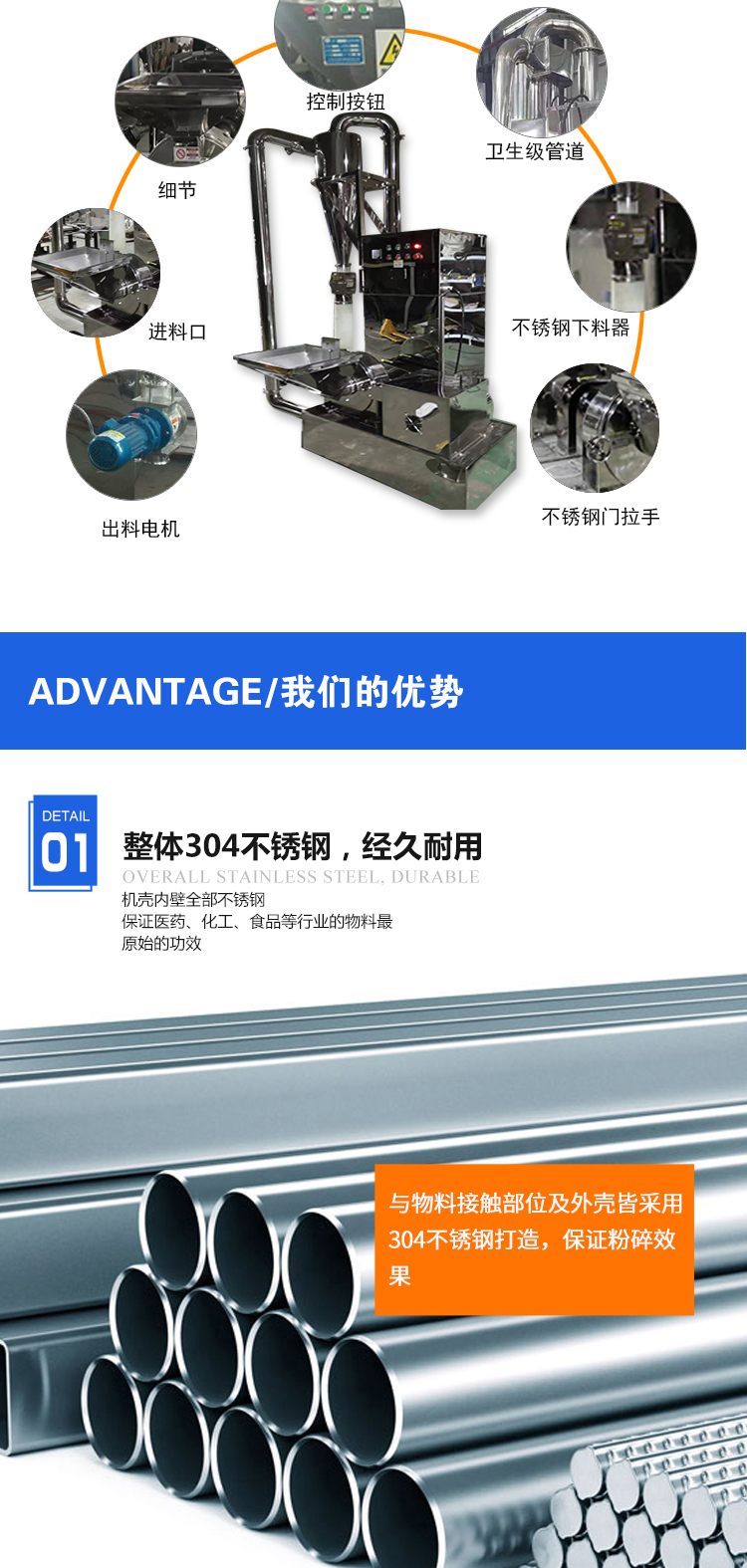 該機由加料斗,篩網(wǎng),粉碎刀片,齒圈,粉碎電機,出料口,風(fēng)葉,集料箱,吸塵箱等部分組成,物料由加料斗進(jìn)入粉碎室,通過高速旋轉(zhuǎn)的刀片進(jìn)行粉碎,更換不同型號的篩網(wǎng)來達(dá)到所要求的物料細(xì)度,高速旋轉(zhuǎn)的風(fēng)葉把達(dá)到要求的物料從粉碎室引到集料箱布袋中,沒有達(dá)到要求的物料繼續(xù)在粉碎室中粉碎,集料箱布袋產(chǎn)生的粉塵由吸塵箱收集,該機組按“GMP”標(biāo)準(zhǔn)設(shè)計,結(jié)構(gòu)簡單,操作清理方便,噪音小,產(chǎn)量高,機器采用不銹鋼材料制作,粉碎過程中無粉塵飛揚