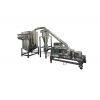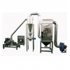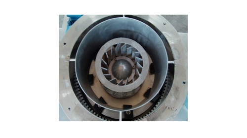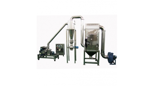 該機(jī)經(jīng)進(jìn)料口螺旋送料器,將物料送入機(jī)體與導(dǎo)流圈之間的粉碎室,在粉碎室內(nèi)被高速旋轉(zhuǎn)的刀片沖擊下,使物料甩向固定在機(jī)體上的齒圈,造成撞擊、剪切,以及物料與物料,物料與刀片、齒圈間的相互碰撞、摩擦、剪切進(jìn)行交替粉碎。粉碎后的物料,在負(fù)壓氣流的拉力作用下,小粉??朔灾?,隨氣流越過(guò)導(dǎo)流圈,進(jìn)入分級(jí)室。分級(jí)葉輪由葉片組成,高速旋轉(zhuǎn)的葉片產(chǎn)生與負(fù)壓相反的離心力,沉入葉道內(nèi)的粉粒同時(shí)受到負(fù)壓氣流的向心力和粉粒自重及葉輪產(chǎn)生的離心力的作用,粉粒中大于臨界直徑(分級(jí)粒徑)的顆粒因質(zhì)量大,被甩回粉碎室繼續(xù)粉碎,小于臨界直徑的顆粒經(jīng)排粉管進(jìn)入旋風(fēng)收集器經(jīng)排料閥排出。分級(jí)葉輪的旋轉(zhuǎn)速度越高,分級(jí)的粉粒越細(xì),調(diào)正分級(jí)葉輪的旋轉(zhuǎn)是控制粉粒大小的決定因素。