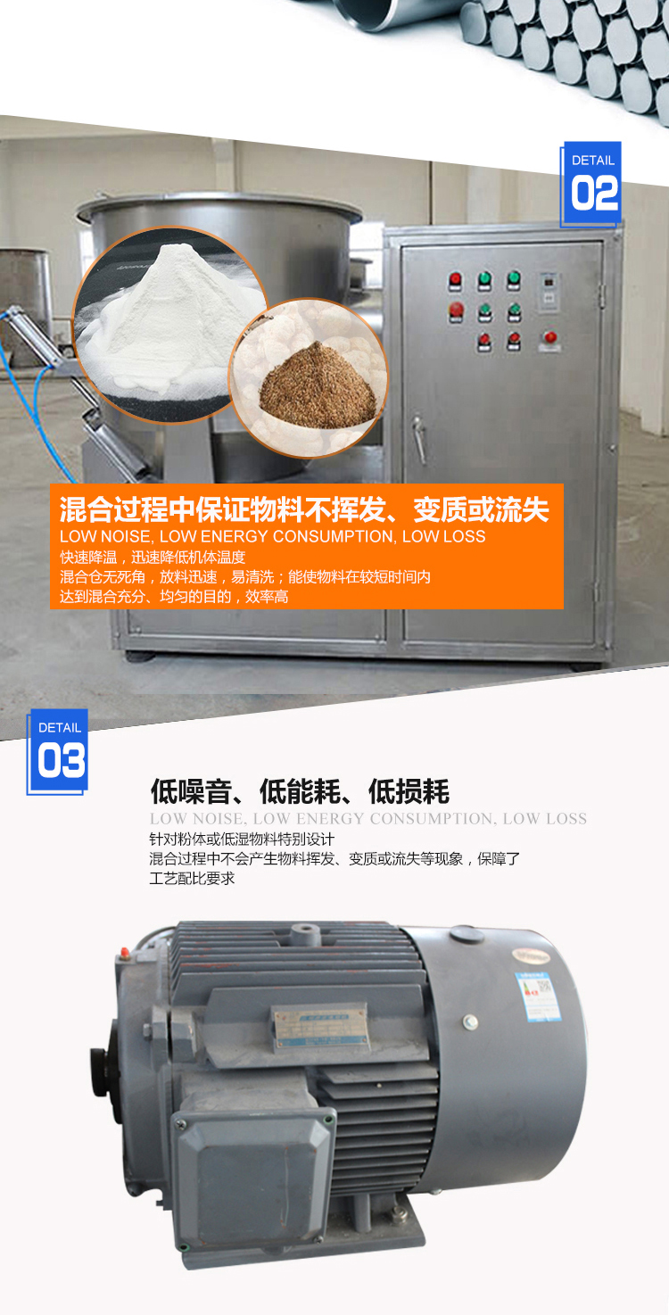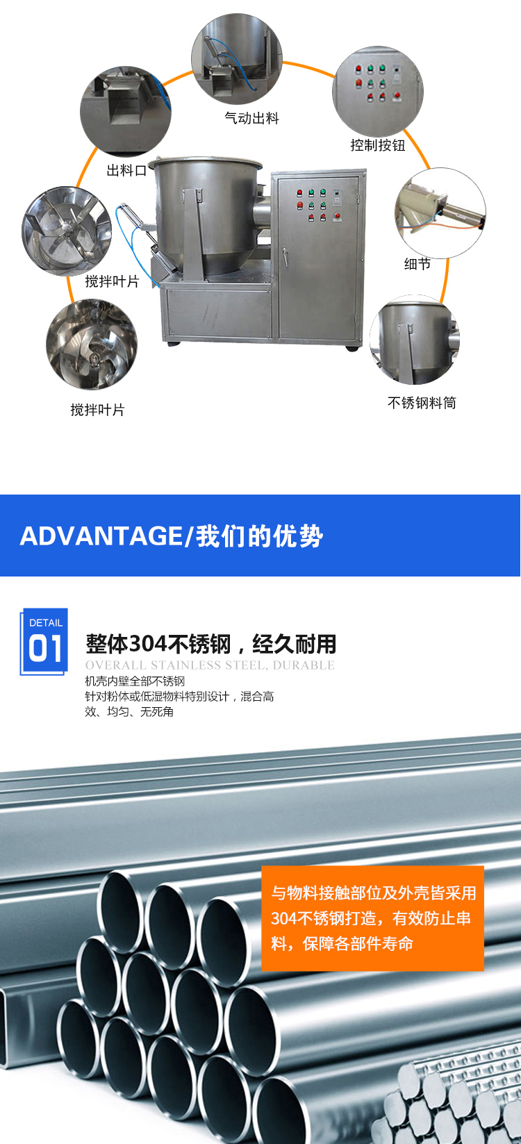5、該機物料接觸部位均采用不銹鋼制作,混合過程中不會產(chǎn)生物料揮發(fā)、變質(zhì)或流失等現(xiàn)象,保障了工藝配比要求;