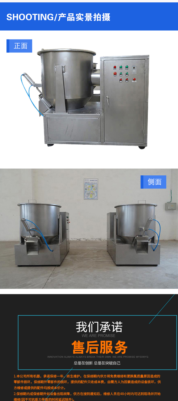 6、該機適用于不同比例的干、濕物料的混合,特別適用于雞精、藥品沖劑、飲料沖劑等多種復(fù)雜物料的混合攪拌。